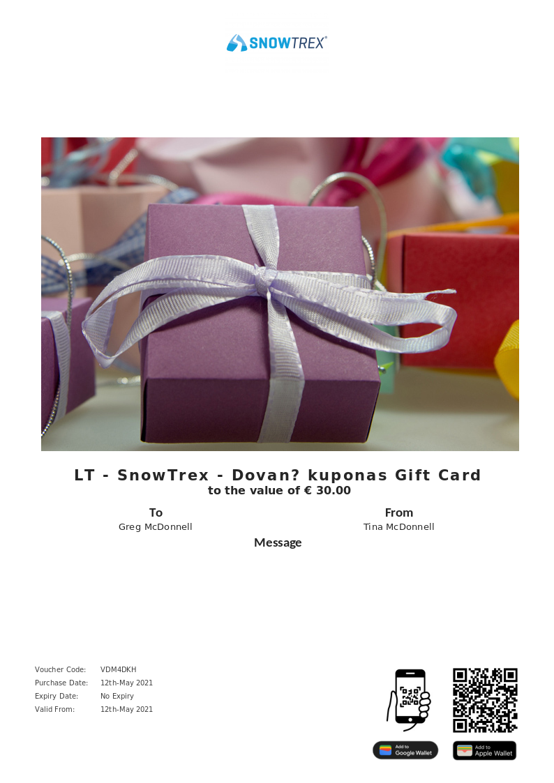 LT - SnowTrex - Dovanų kuponas allows you to purchase instantly printable gift vouchers, special offers and tickets using the Voucher Connect platform.